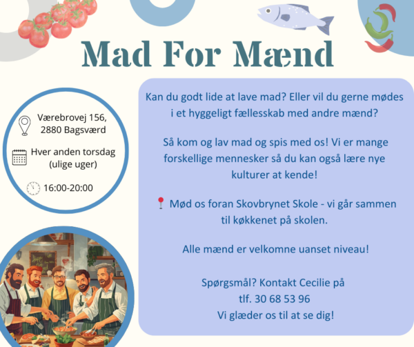 Så kom og lav mad – og spis med os! Her mødes mænd med forskellige baggrunde, og sammen laver vi et måltid, som vi bagefter nyder i fællesskab. Det er en god mulighed for både at dele det, du selv kan, og lære nye retter og madkulturer at kende.